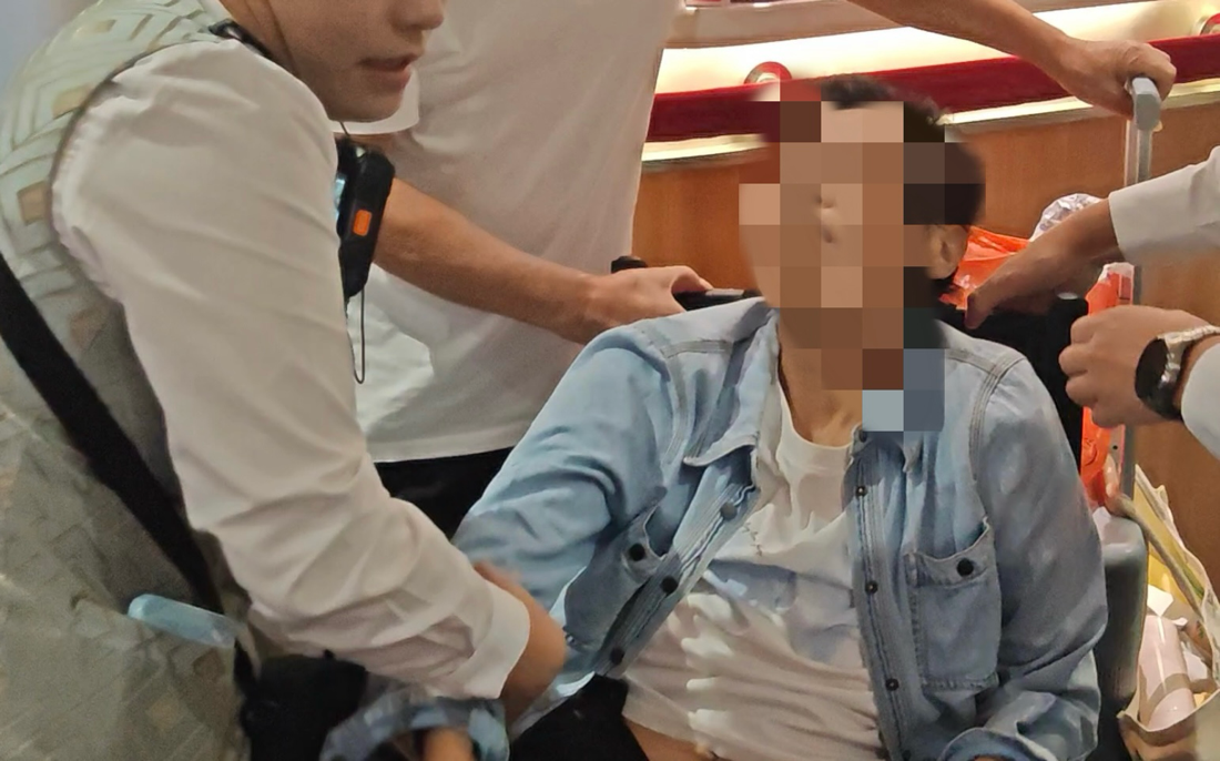 接到通报后,列车长李玮谞快速前往9号车厢处置,车队党总支书记蔡硕与列车长密切配合,为最大限度争取救治时间,当即抱起患病旅客,小心翼翼地将其安置在轮椅上,随后两人默契配合,合力推着轮椅快步向站台转运。